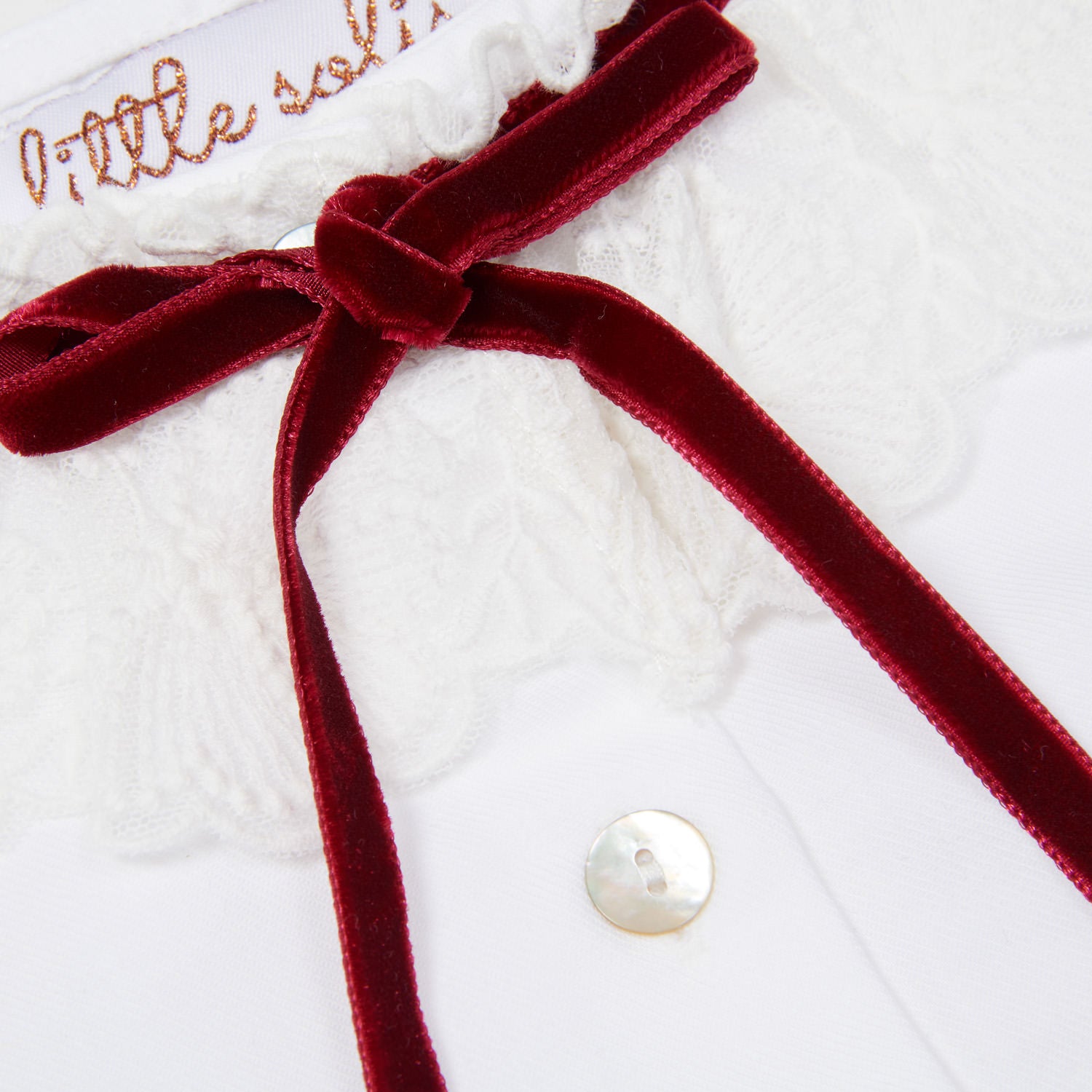 This refined two-piece set blends timeless charm with playful elegance. The crisp white blouse is crafted from 100% cotton poplin and features delicate lace at the collar and cuffs, finished with a deep burgundy velvet tie at the neckline. The coordinating bloomer-style skirt is made from rich burgundy velvet (92% polyester, 8% elastane), offering a soft and comfortable fit. A layer of fine tulle (100% polyamide) adds subtle volume, while a white lace trim brings a touch of vintage sophistication. Oversized velvet bows on either side complete the look with a luxurious flourish.