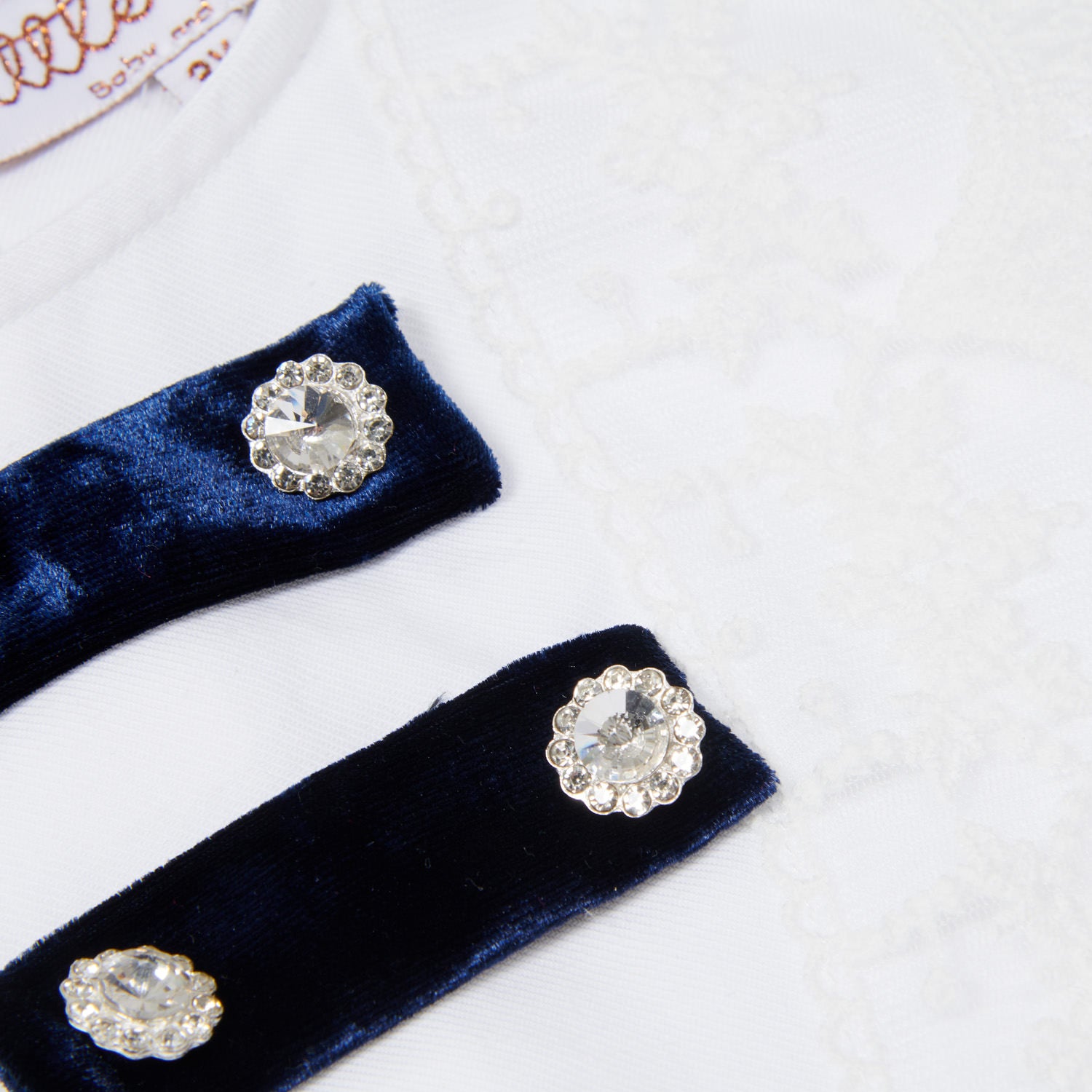 A charming expression of timeless elegance and playful sophistication, this set brings together rich textures and classic detailing. The blouse is crafted from 100% crisp white cotton, featuring a delicate lace-trimmed bib and romantic ruffled cuffs. Two velvet ribbon accents adorned with crystal-style buttons add a regal touch to the front.