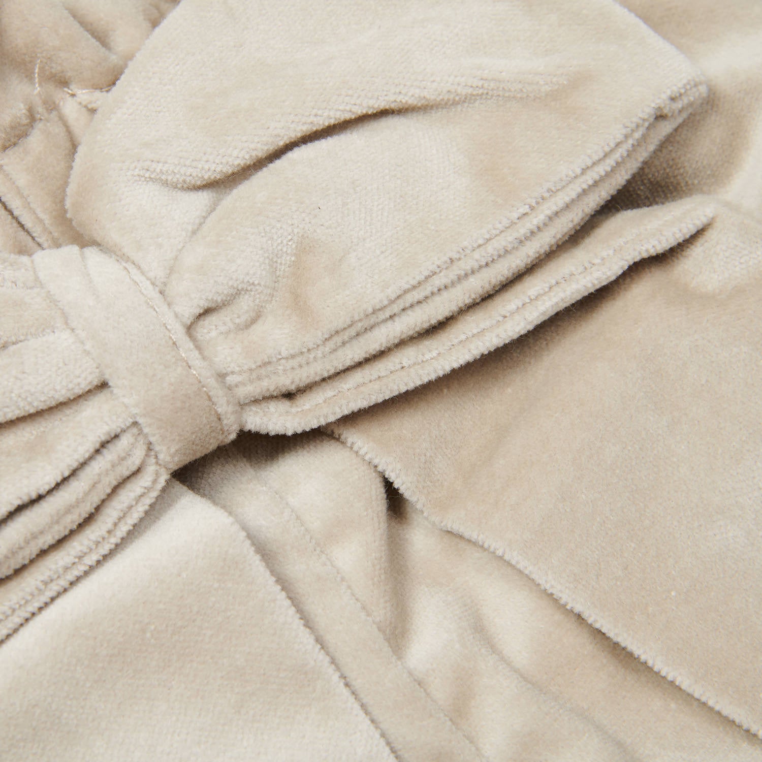 A charming addition to her elegant wardrobe, these soft velvet shorts in a delicate cream hue bring a touch of sophistication to everyday dressing. Crafted from plush stretch velvet, the design features finely pleated pocket flaps accented with subtle gold trim for a refined finish. A standout detail is the oversized bow at the back, adding a playful and graceful touch to the silhouette. The gently elasticated waistband ensures all-day comfort and ease of movement.