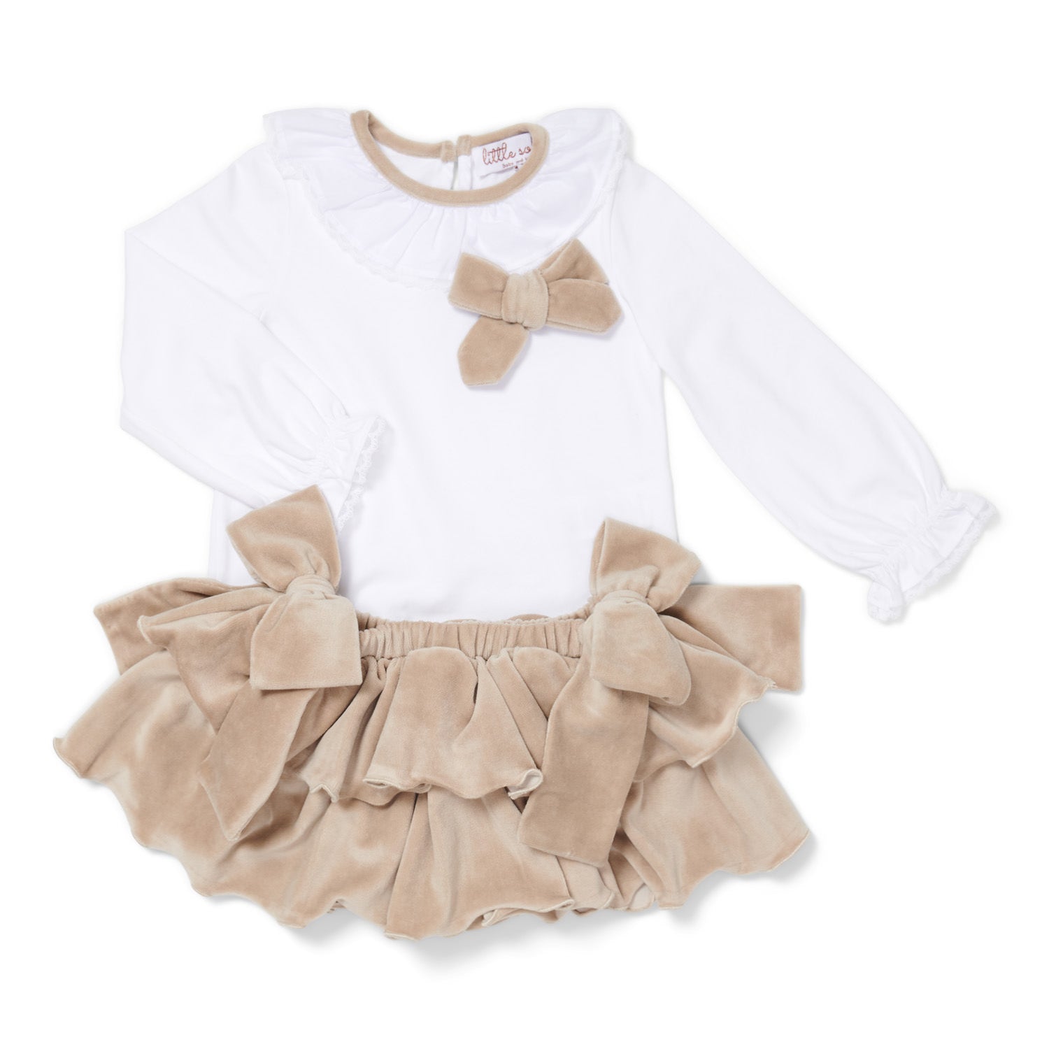 - Beige velvet ruffle skirt with large decorative bows and diapercover