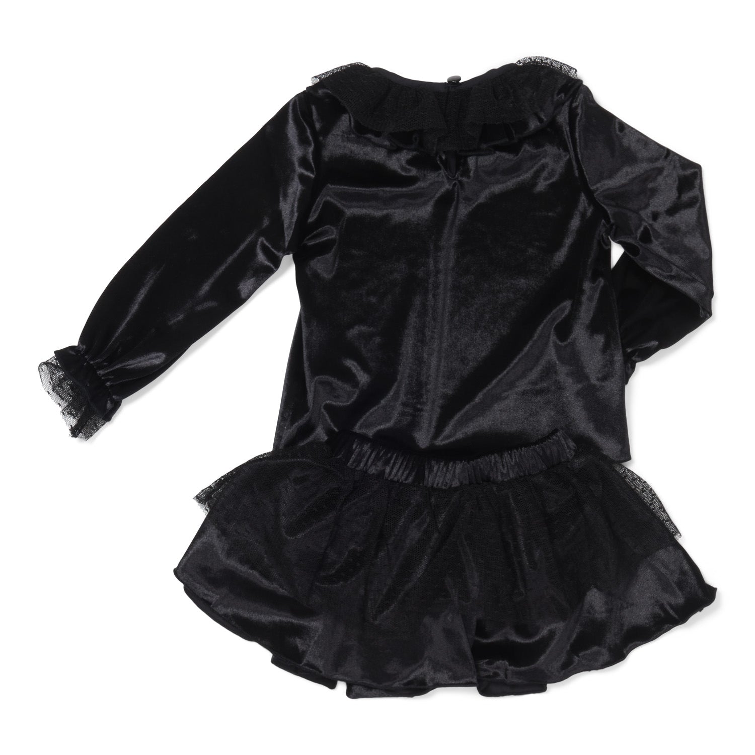 Elevate her occasion wardrobe with this sophisticated two-piece set in jet black velvet. The blouse is crafted in soft stretch velvet with elegant ruffle detailing and crystal-style button at the neckline, finished with fine lace trim on the sleeves. The matching skirt features a voluminous silhouette with layered tulle lining for a playful, full shape — completed with a statement velvet bow adorned with a sparkly embellishment.